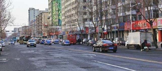 图为由东四条路西望东新安街。牡丹江电力生产调度中心是新安街上标志性建筑之一。
