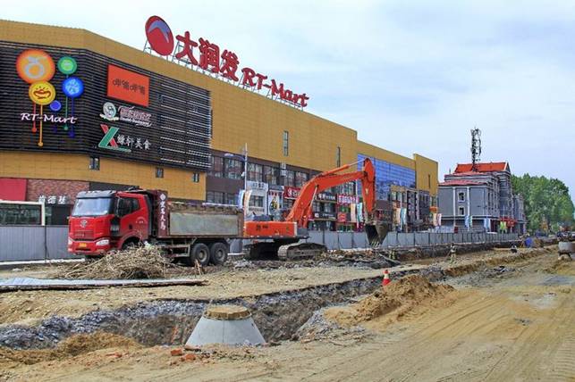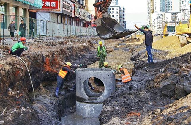 图为铺设污水管线的施工现场。污水管线的直径有一米半。