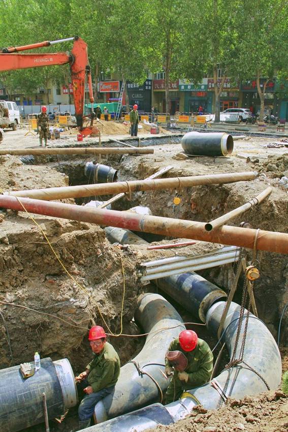图为施工人员正在铺设由新安街的供热主干线通往生活区的供热支管线。