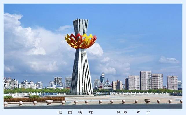 图为矗立在大江右岸带状公园牡丹广场中的雕塑——绽放,是牡丹江标志性建筑景观之一。