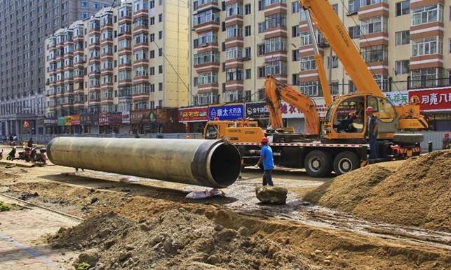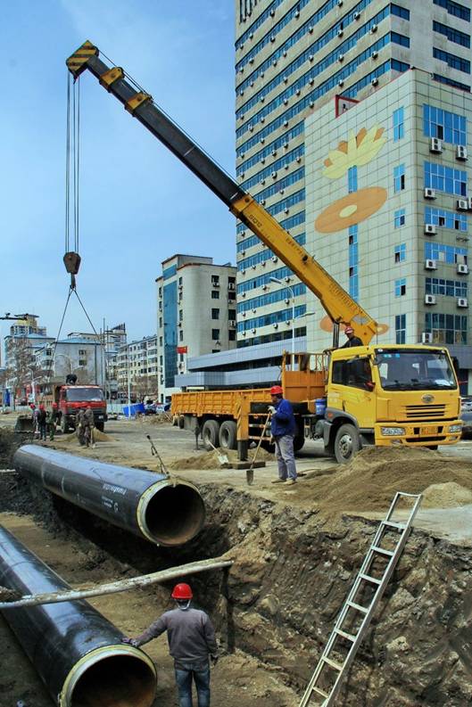 安装铺设供热管道的现场可以看到施工过程的复杂和难度。
