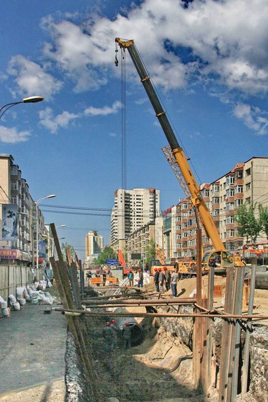 东七条路地段的地下水位比较高,施工难度特别大。两侧必须砸入防止地槽坍塌的工字钢梁。工程竣工后需要一根一根的提出来。