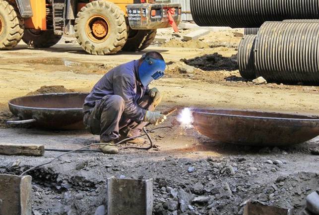 工人师傅正在为封堵管道的锅形钢板焊接吊装铁环。
