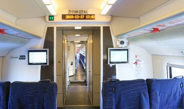 车厢两头门的上方配有滚动电子屏幕。实时显示运行时间、行车速度、内外温度、前方到站。列车语音广播提醒前方到站的旅客做好下车准备。小编感觉很周到,很温馨。