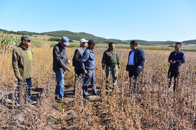穆棱市种子管理站高级农艺师徐明贵(右3)向与会人员介绍大豆新品种