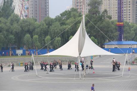 现代艺术和建筑融为一体的膜结构凉亭下,爱好拉丁舞的市民特别尽兴