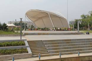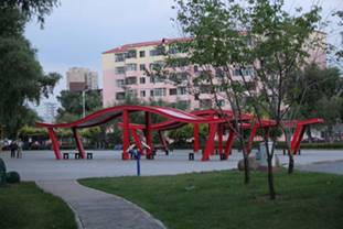 双龙广场上的拉膜亭,在众多公园 两排似金、银龙的造型和宫灯组合,