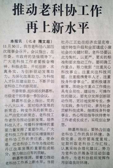 日在头版报道我市老科协召开八届四次理事会消息,题目为“推动老科协工作再上新水平”。同日在牡丹江政府网站转载。