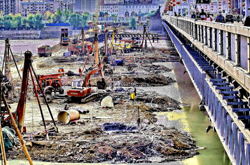 在滔滔的江水之中架起钢结构的施工栈桥