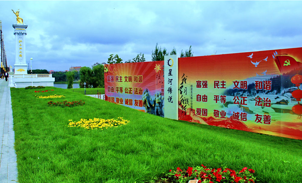 金色的牡丹江大桥五个字映射耀眼的光芒 大桥旁的社会主义核心价值观宣传板