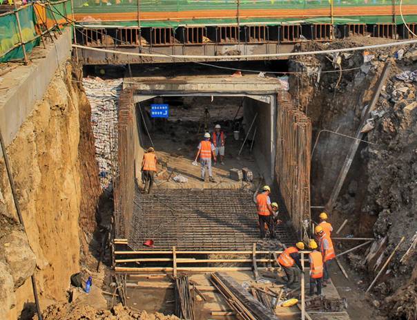 在纵横交错的工字钢粱之下,又挖通一个管道专用涵洞